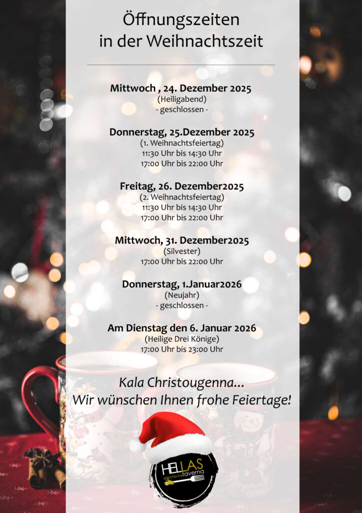 die Feiertage sind eine besondere Zeit, um gemeinsam zu genießen. Wir freuen uns sehr, diese festlichen Tage mit Ihnen in der Hellas Taverna zu verbringen.
